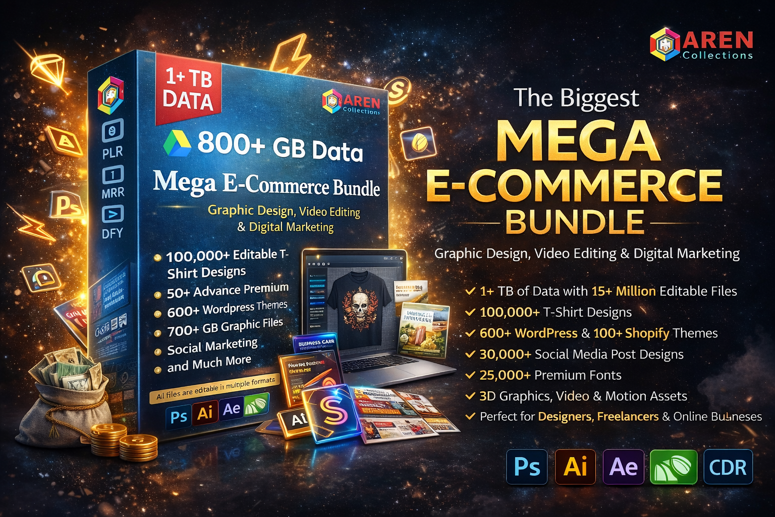 The Biggest Mega E-Commerce Bundle is an all-in-one digital package for graphic design, video editing, and digital marketing.